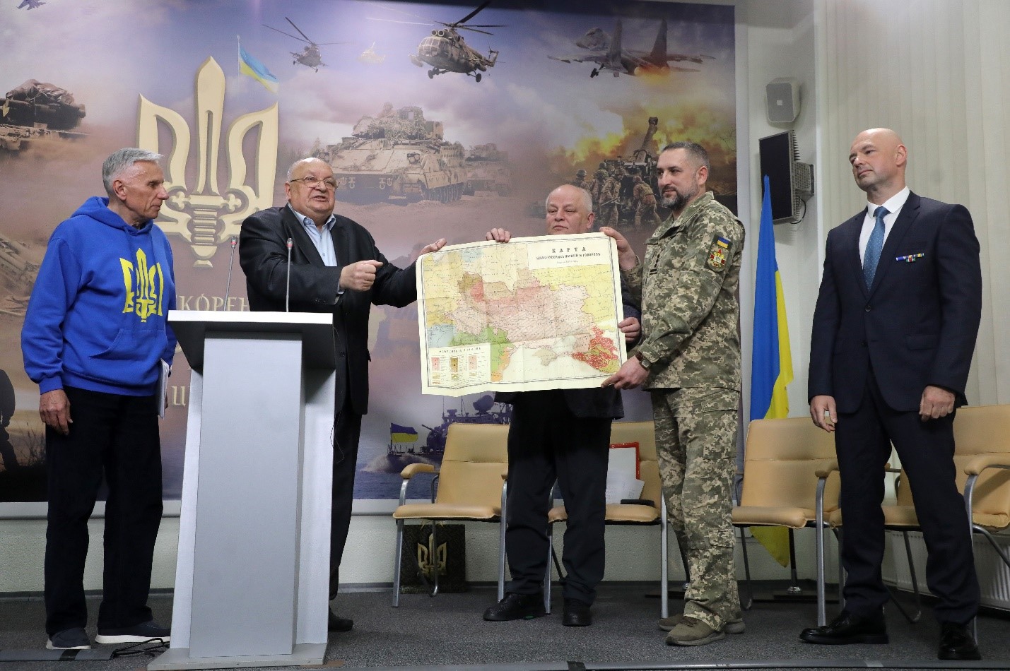 Директор Інституту української мови НАН Павло Гриценко акцентував на назві фотолітопису – «Нескорена Україна у війні цивілізацій». «Це не просто гасло: сьогодні ми, а завтра ви станете жертвою російської агресії. Ні, це само собою зрозуміло. Проблема глибша і ширша – чи зможе сьогоднішня цивілізаційна спільнота подолати давно зужиту, безперспективну модель, згідно з якою сьогодні у світі перемагає не право, усталені правила співіснування, а мілітарна, економічна та фінансова сила. Ми ніколи не будемо у безпеці, доки оця стара модель, модель сильного, не буде під контролем», – відзначив Гриценко.