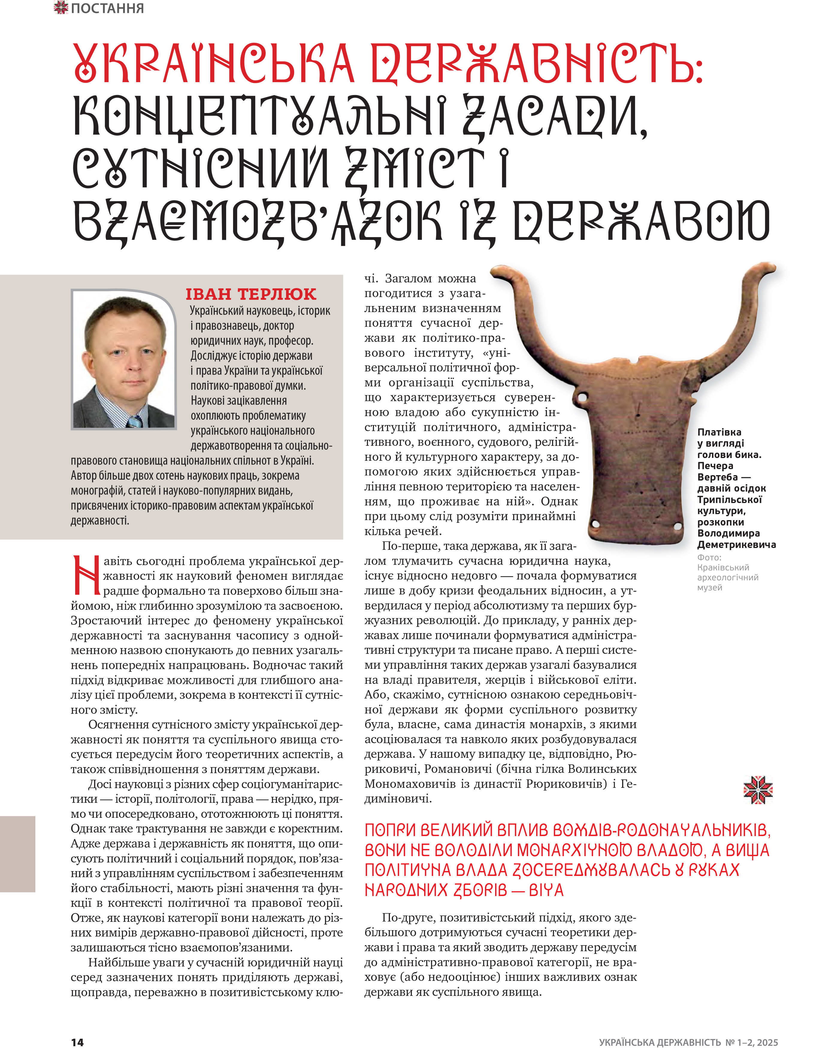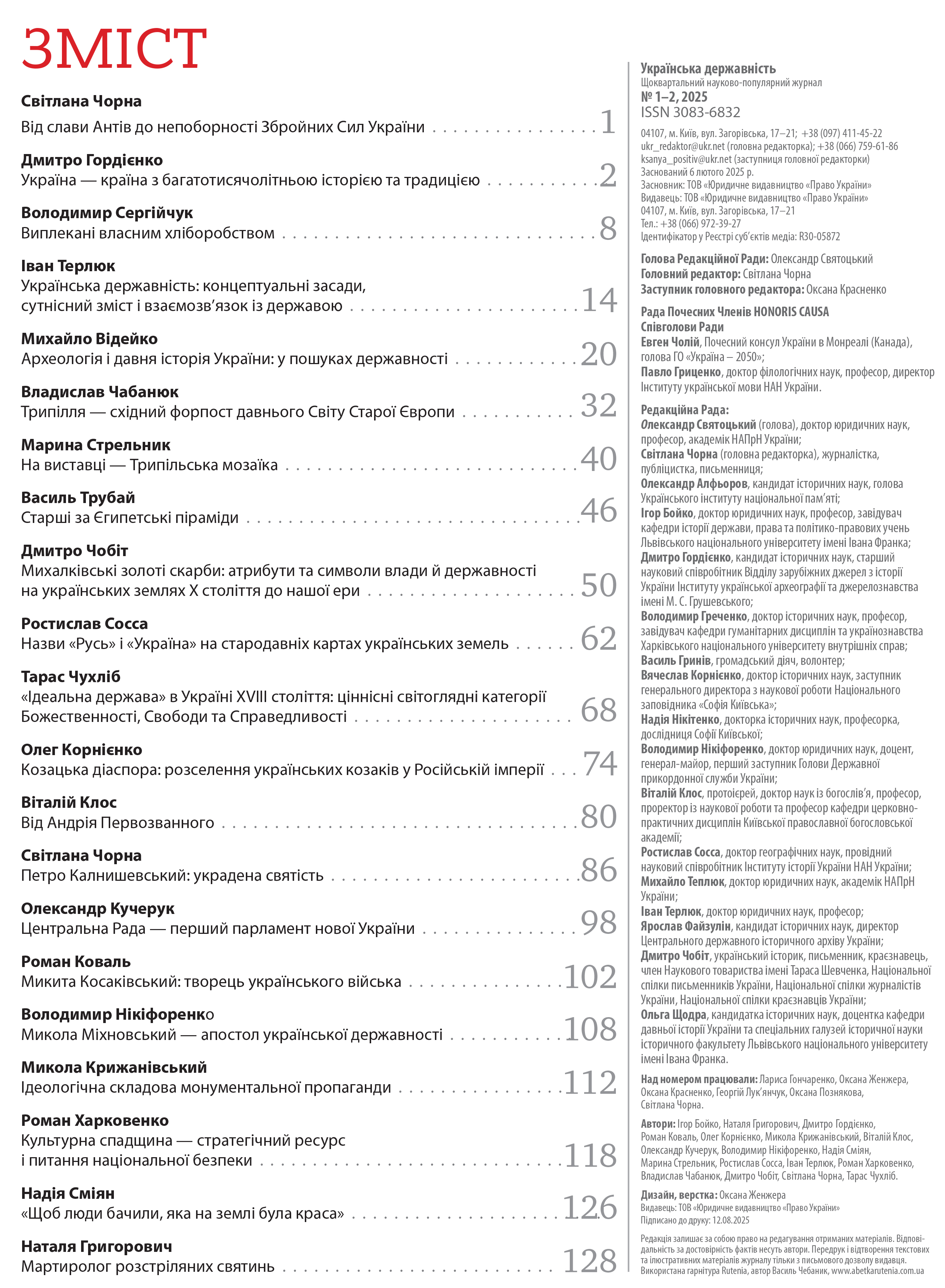 Вашій увазі представляємо перший випуск нового щоквартального науково-популярного журналу «Українська державність» (№ 1–2/2025), засновник і видавець якого — юридичне видавництво «Право України». Головна редакторка — Світлана Чорна, відома журналістка та письменниця.
