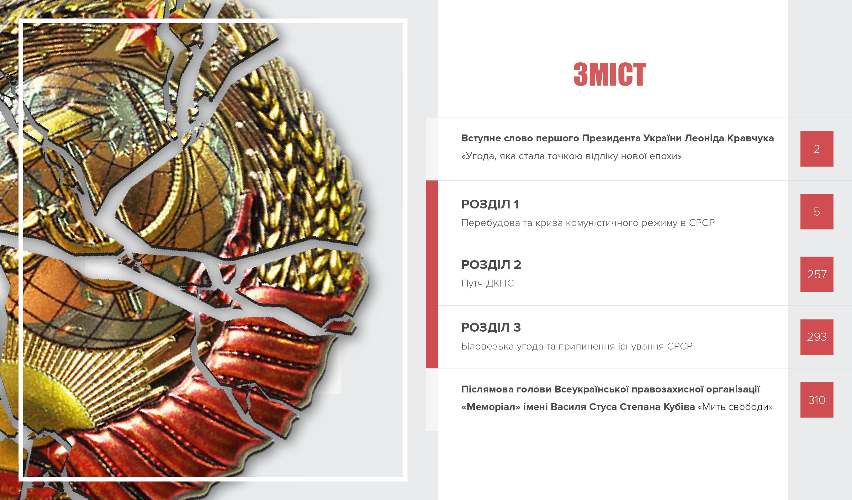 Видання оповідає про кризу комуністичного режиму в СРСР, серпневий путч 1991 року, Біловезьку угоду 8 грудня 1991 року та припинення існування Радянського Союзу як суб’єкта міжнародного права.